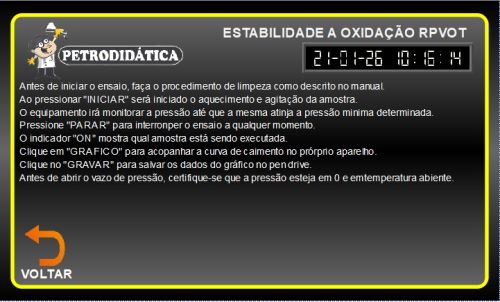 O RPVOT – Estabilidade à Oxidação é um equipamento utilizado para determinar a resistência à oxidação de óleos de turbina novos e em uso, conforme a norma ASTM Internacional ASTM D 2272. O ensaio simula condições severas de operação, submetendo a amostra a alta temperatura, pressão de oxigênio e presença de catalisador metálico, permitindo avaliar com precisão a degradação do lubrificante. É uma ferramenta essencial para laboratórios, usinas de energia e fabricantes de óleo que necessitam de controle de qualidade confiável e resultados padronizados.