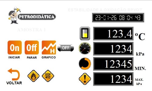O equipamento é composto por um vaso de pressão rotativo em aço com aquecimento integrado e controle eletrônico, operando a 100 RPM com inclinação de 30°, garantindo uniformidade no ensaio. Possui sensor de temperatura tipo J e sensor de pressão (0 a 2000 kPa), com monitoramento digital em display touchscreen de 7”. Realiza registro gráfico em tempo real e permite exportação de dados via USB para análise no Excel. Acompanha frascos de oxidação em vidro borossilicato e bobina catalisadora de cobre (fio nº 14), com capacidade para duas amostras independentes, oferecendo maior produtividade ao laboratório.