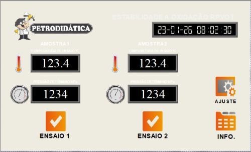 O equipamento é composto por um vaso de pressão rotativo em aço com aquecimento integrado e controle eletrônico, operando a 100 RPM com inclinação de 30°, garantindo uniformidade no ensaio. Possui sensor de temperatura tipo J e sensor de pressão (0 a 2000 kPa), com monitoramento digital em display touchscreen de 7”. Realiza registro gráfico em tempo real e permite exportação de dados via USB para análise no Excel. Acompanha frascos de oxidação em vidro borossilicato e bobina catalisadora de cobre (fio nº 14), com capacidade para duas amostras independentes, oferecendo maior produtividade ao laboratório.