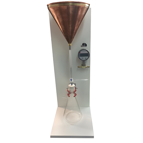 Este aparelho é utilizado em laboratórios e ensaios técnicos com a finalidade específica de medir a retenção de água em argamassa, utilizando o método do funil de Buchner. É um equipamento essencial para análises de qualidade e conformidade de materiais de construção.